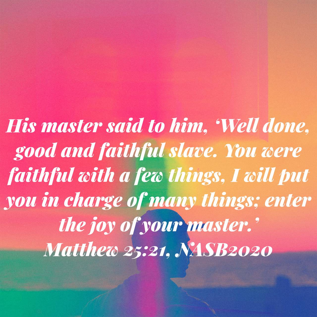 “Now after a long time the master of those slaves came and settled accounts with them. The one who had received the five talents came up and brought five more talents, saying, ‘Master, you entrusted five talents to me. See, I have earned five more talents.’ His master said to him, ‘Well done, good and faithful slave. You were faithful with a few things, I will put you in charge of many things; enter the joy of your master’” (Matthew 25:19-21, New American Standard Bible).